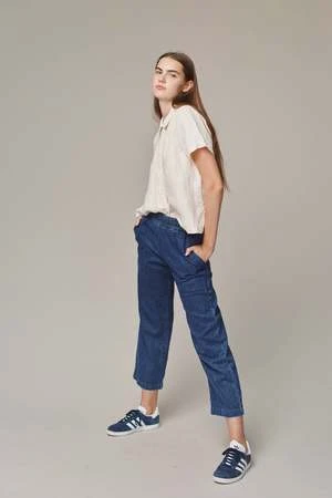 An easy to wear, pull-on Ocean Pant with slouchy wide legs. USA made hemp pants with high waist creates a flattering shape while the adjustable hidden drawcord and relaxed fit through the hip + thigh makes these a super comfortable wear. The crop is just high enough to stay dry in a rising tide and has a retro look when worn with sneakers or sandals.