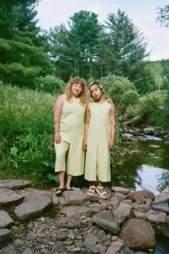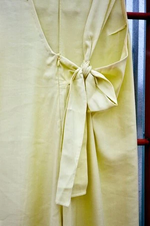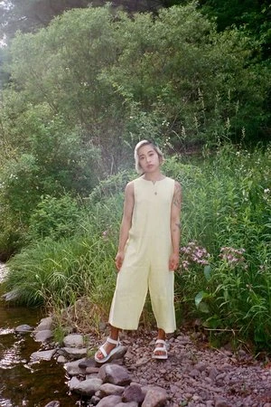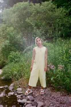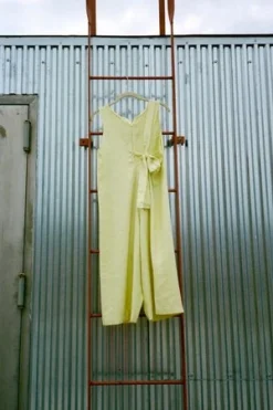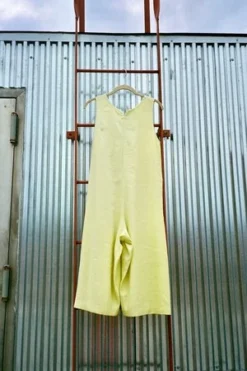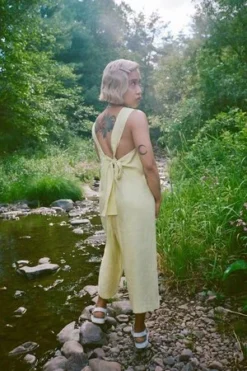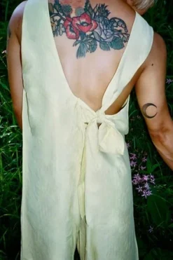 Simplicity up front, tasteful party in the back: the Cat Chu Back Knot Tie Onesie in Lemon Yellow from Kaarem. A sleeveless cropped jumpsuit in soft lightweight Rayon blend, featuring an adjustable low back tie, allowing for customizable length. Center back seam zipper, and center seam front.