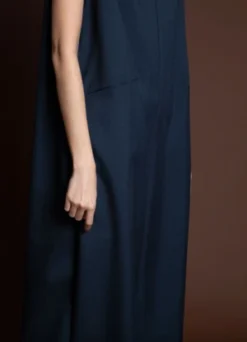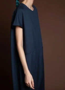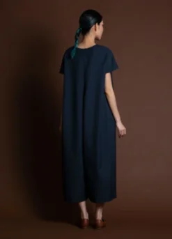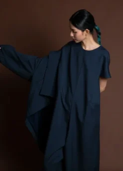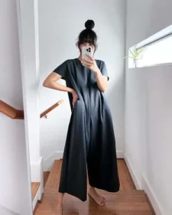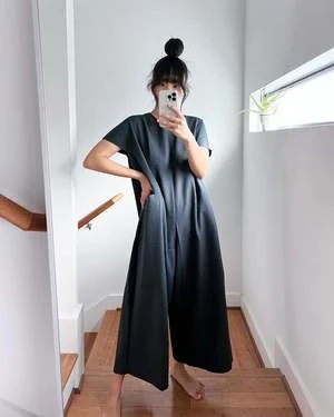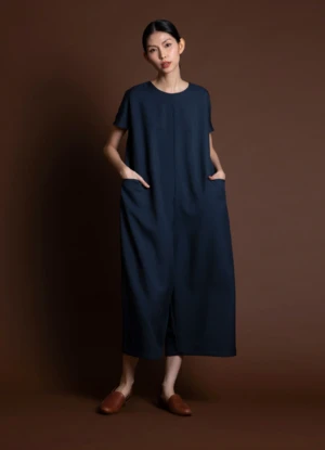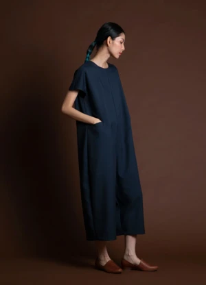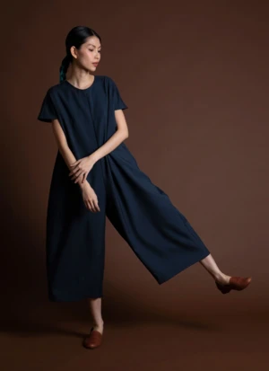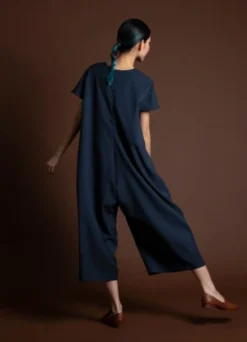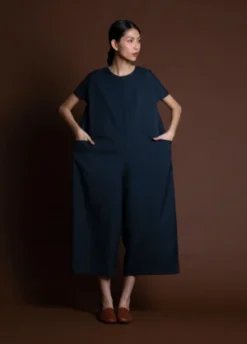 Short sleeve cropped jumpsuit with dolman sleeves. Inner pleatstay construction detailing at the shoulder creates an effortless smooth and flat drape. Center back seam zipper enclosure. Two generous side pockets. Voluminous body that drapes from the shoulder down.