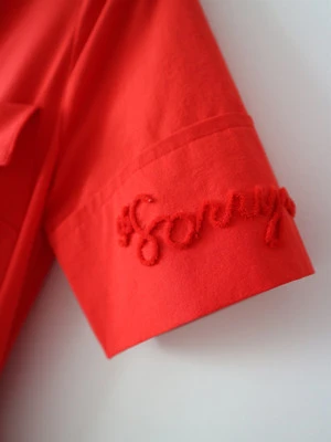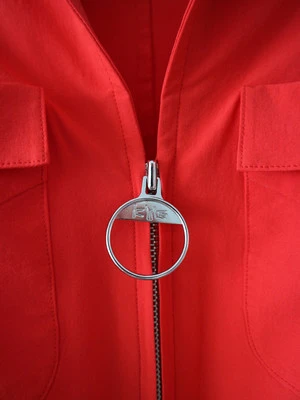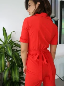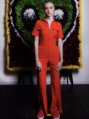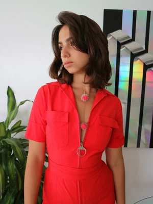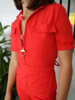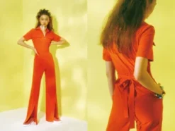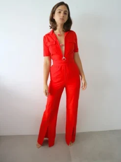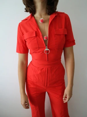 Bright red 70s style jumpsuit. Long flared, exaggerated legs. 2 front pockets at bust and at hips. Silver circle zipper with engraved KYE logo. Elastic back with attached long wrap ties around waist. The fabric and cut of this jumpsuit make it severely flattering. It’s one of those pieces that you must try on.