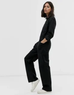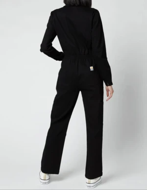 Black version of our classic fitted boilersuit. Elasticated at the waist with wide, straight legs. In heavy weight cotton drill with a small amount of stretch.