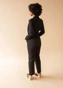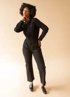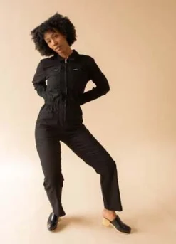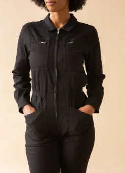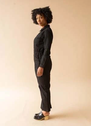 The Jet Black version of our classic fitted boilersuit, now in 100% heavy weight, non-stretch cotton canvas. Features exposed zipper hardware and angular workwear style chest pockets. Elasticated at the waist with wide, straight legs.