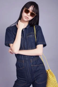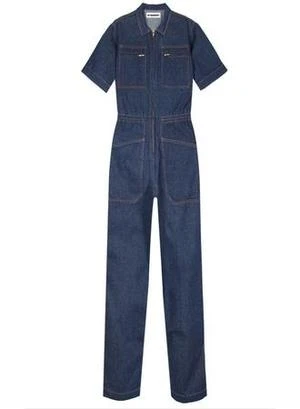 Slim fitting 70s style denim boilersuit with front zip, elasticated waist at back and front zip. Straight leg looks good rolled up or left long. In a heavy weight denim with contrast terracotta stitching.