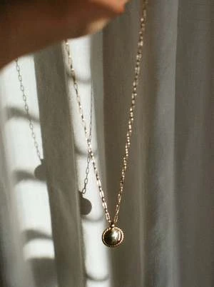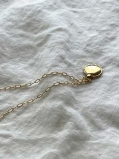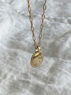 Braided Rosa Pendant by Laura Lombardi is circular brass pendant with braided detail on 14kt gold plated brass chain. and lobster claw closure. Layer with the classic Box chain with a white t-shirt or tank for an elevated everyday look.