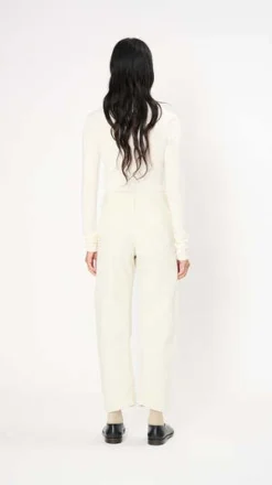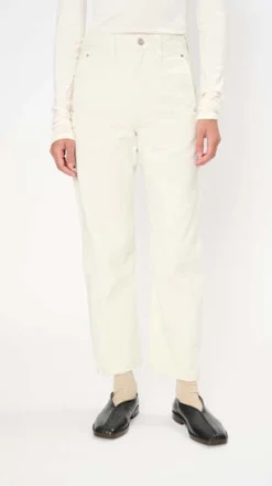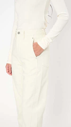 The Twisted Pants are a core style for Lemaire with a high-rise and slightly bowed leg silhouette created from twisted side seams. They feature a zip-fly, side pockets with metal stud detail, and back patch pockets.