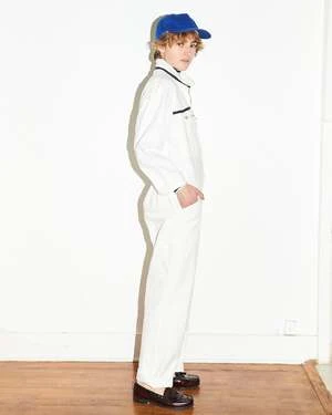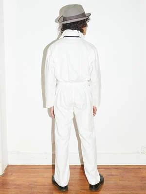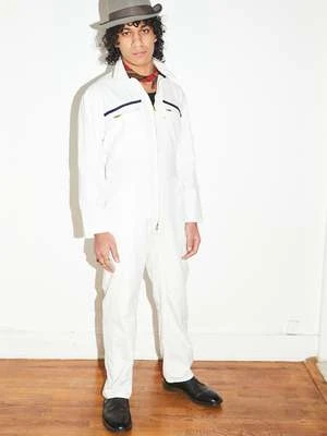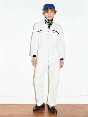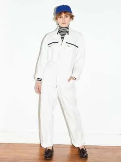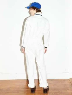 This Limited Edition secondhand workwear Suit with a button zip front placket and cinched waist has been up-cycled with a navy twill tape neck and front pockets.