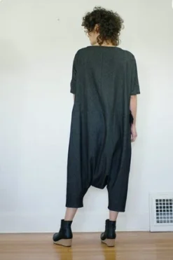 Cat is 5’3″ and wears the petite. This style runs narrow at the arm + leg holes; please consult our flat measurements below!
