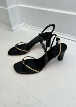 The Riley Heel by Maryam Nassir Zadeh is an open toe, strappy heel featuring a wraparound self-tie ankle strap and gold details. Heel height is 7.5cm.