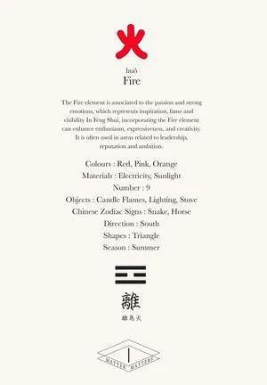 Fire represents inspiration, fame, and visibility. Utilising the fire element helps in increasing enthusiasm and leadership skills, and encourages boldness, expressiveness, and inspiration.