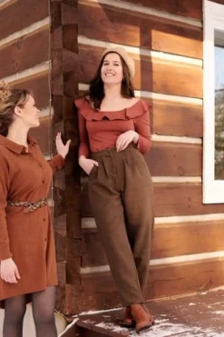 Meemoza’s Maelle Pants are back! This style sells out quickly every season for a reason. These vintage-inspired trousers have a high waist, tapered fit in the legs and a cropped hem great for pairing with boots. They have a zipper and button closure in the front, but there is a secret elastic band on the back helping you to get the perfect fit. These dress pants are great for work paired with a long-sleeve button-up or blouse.