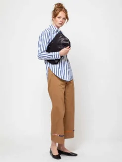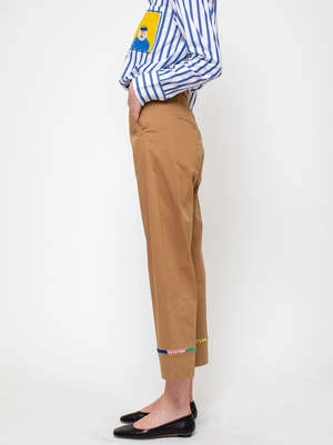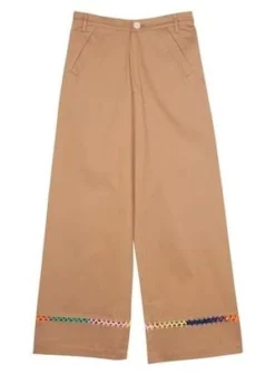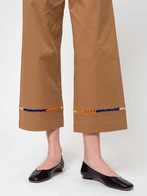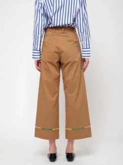 Cotton poplin pants with button-zipper closure, slash pockets, belt loops and faggoting stitch with multi-color embroidery thread near the hem. Slightly cropped. Model is 6′ and wearing size small.