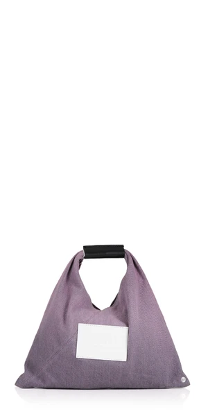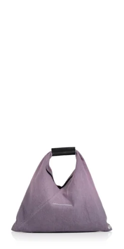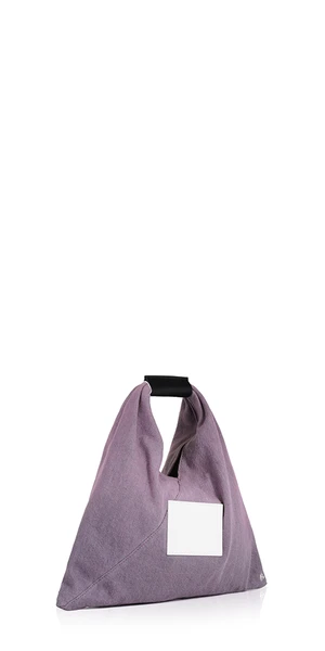 Japanese bag in a gradient pink dyed washed denim. First introduced as part of the Autumn-Winter 2009 collection, the Japanese bag has since become MM6s most emblematic accessory. Its distinctive triangular silhouette is inspired by the Japanese art of paper folding, origami. The buttons at its edges allow for the bag to change form through folding, evoking the Maisons deconstructionist design codes. Each season, the Japanese bag is reinterpreted in additional sizes and a variety of innovative fabrics, rendering the accessory timeless.