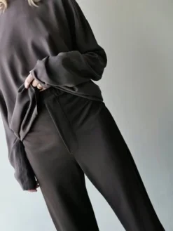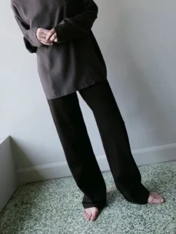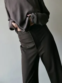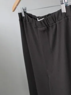 MONIQUE VAN HEIST SAILORETTE PANT IN BROWN. ELASTIC WAIST STRETCH PANTS WITH A SLIGHTLY FLARED LEG IN A BROWN POLYAMIDE BLEND. DETAILS INCLUDE FLY-LIKE DETAIL AT FRONT AND DARTED BACK WAIST. MEASURES APPROXIMATELY 46 INCHES IN LENGTH.