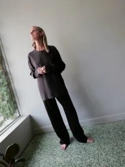 MONIQUE VAN HEIST SAILORETTE PANT IN BROWN. ELASTIC WAIST STRETCH PANTS WITH A SLIGHTLY FLARED LEG IN A BROWN POLYAMIDE BLEND. DETAILS INCLUDE FLY-LIKE DETAIL AT FRONT AND DARTED BACK WAIST. MEASURES APPROXIMATELY 46 INCHES IN LENGTH.