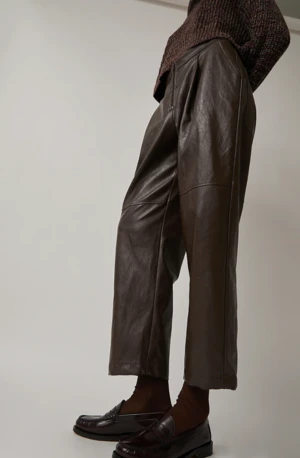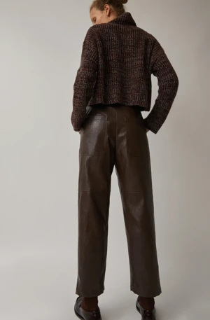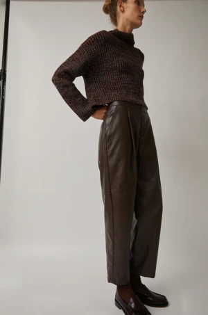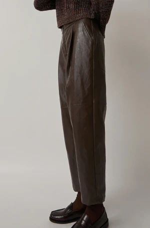 Meet your new go-to pant. This pleated pant is crafted from substantial vegan leather and features a slightly curved leg that tapers at ankle. We’re styling these with just about everything!