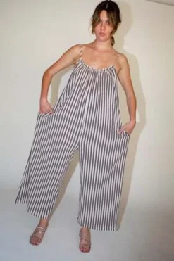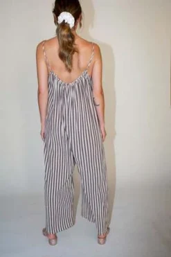 – Effortless throw on and go jumpsuit in soft yet structured striped cotton. Raw edge ruffle detail runs along scoop neckline and low back. Wide leg with drop crotch. Adjustable spaghetti straps. Slip pockets. Relaxed, slightly oversized fit. Looks great layered.