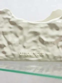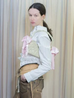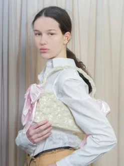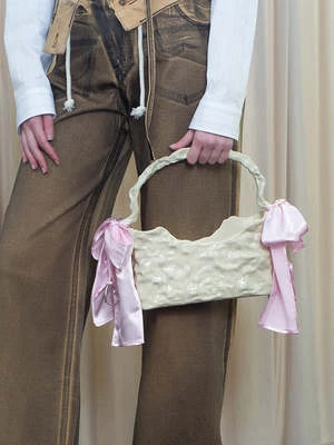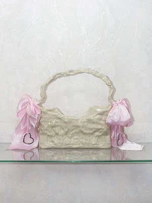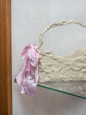 These iconic bags fooled us, they really did. Did you think they really were ceramic? Like you’re really expected to be walking around with a glass box on your nights out? No, they’re actually made from a polymer resin that feels more like structured rubber. Quite an incredible feat of sculpture, these bags. Pink satin ribbon accents and metal heart charms, sculptured handle. Tonal debossed logo. Dustbag and box included. 10″ w x 6″ h x 2″ d.