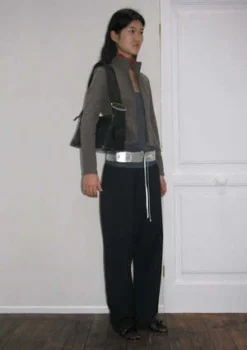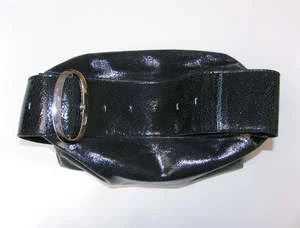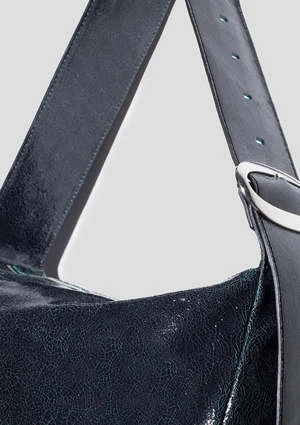 Soft leather bag with buckle and adjustable handle. Zip closure.