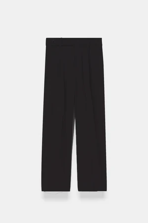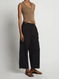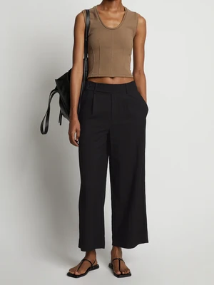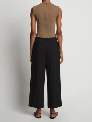 The Drapey Suiting Wide Leg Pants in brown are cut to a cropped, wide-leg silhouette. Belt loops and front pleats. Side slip and buttoned back welt pockets. Side button and concealed zip closure..
