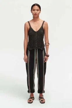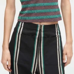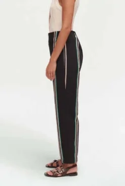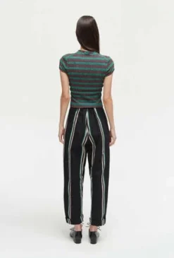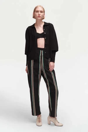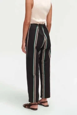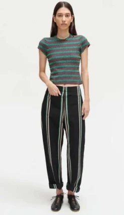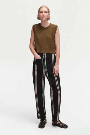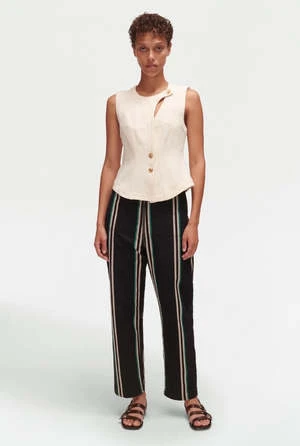 An RC classic, this zip-front straight leg pant with a slight crop is a sister to the Barrie Jumpsuit, cut this season in Awning Stripe cotton canvas. This style is roomy yet snug around the hips, with an elastic panel at the back waist for extra comfort. Exposed zipper closure adds length to the silhouette. Looks great rolled at the hem. Size down if you prefer a higher rise and / or slimmer fit.