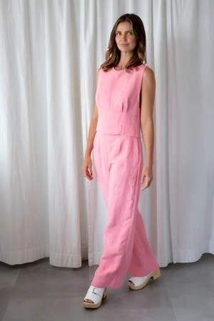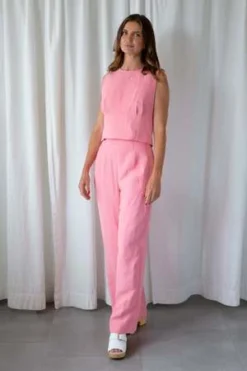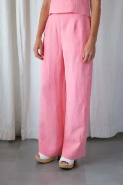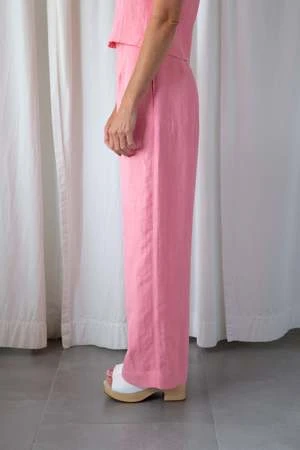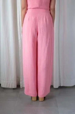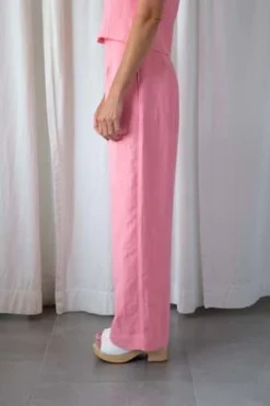 High-waisted, wide-leg pant with front darts in a pink textured viscose linen blend.