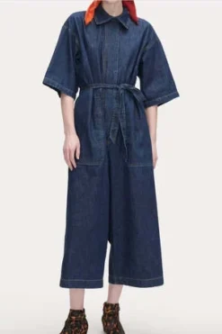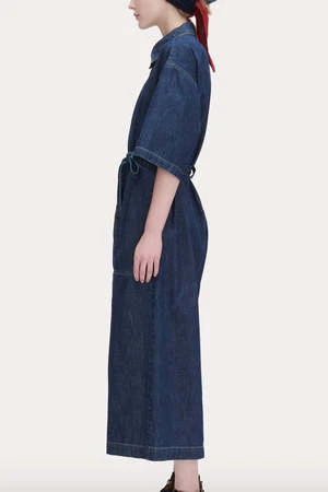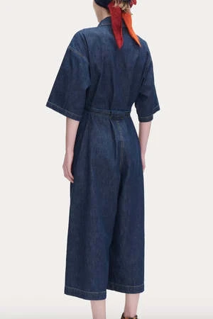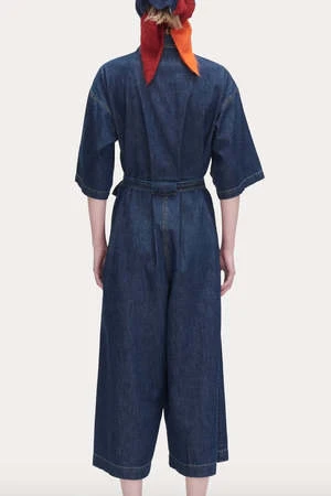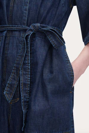 Shirt collar jumpsuit with three-quarter sleeves, waist-tie belt and a cropped leg, in lightweight Vista Denim.