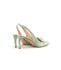 The Indus Velvet Heel in Mint Green by Rupert Sanderson is a suede sling back, mid-heel featuring a pointed toe, heel strap, and gold bamboo detail.