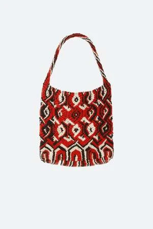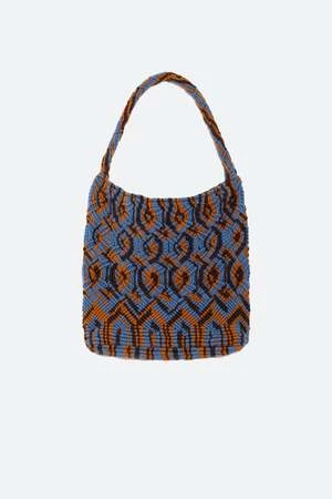 The Drew hand crochet macram knit tote features a multi colored knit pattern.