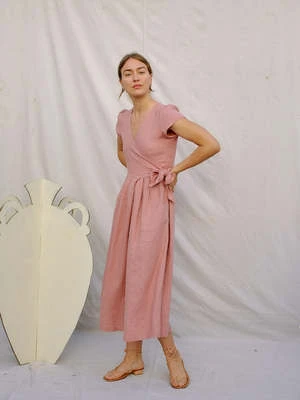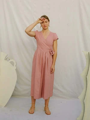 One of our most loved pieces! The Angela Jumpsuit is fitted with shirred cap sleeves, wrapping at the torso for an adjustable look. This jumpsuit is made from naturally light and airy linen, features pleated wide-legs, hidden pockets, and is cut to be slightly fitted at the bust. Look effortlessly stylish in this easy to wear jumpsuit.