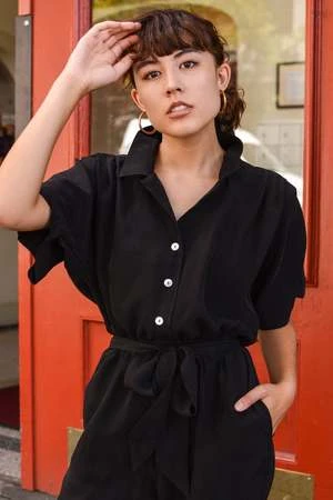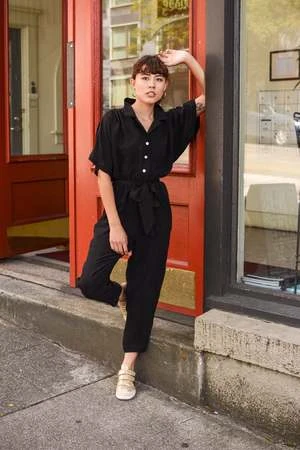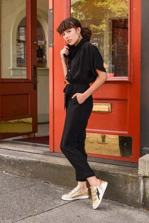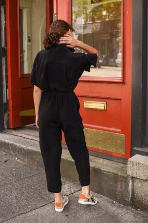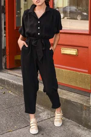 From the Sway and Cake house label, the Margaux Jumpsuit now comes in a silky soft black cupro. Soft drapey fit with button-front and notched collar, elastic waist with matching tie belt, pockets, and cropped leg. Looks great on all body types!