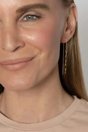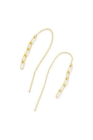 14k gold filled cable chain threaders w. a delicate bar x elongated chain at either end. Each earring measures 5.5″ in length.