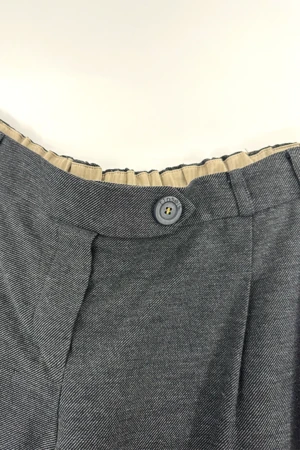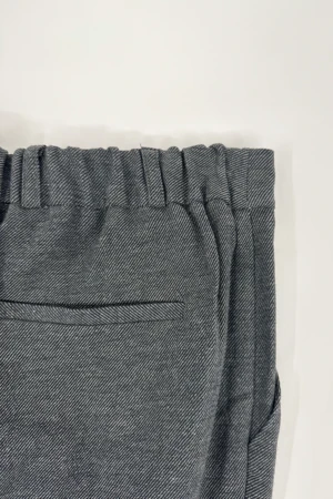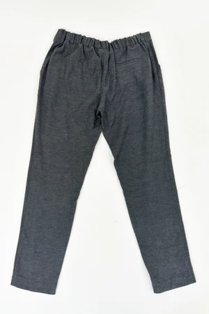 Lightweight grey straight-leg pant, cargo style pockets, belt loops, elastic waistband at the back, slightly cuffed bottom, two-botton closure.