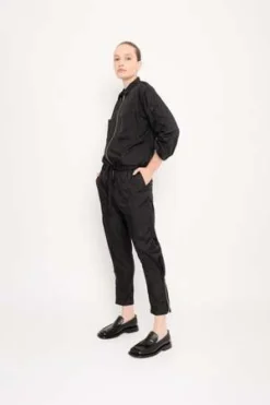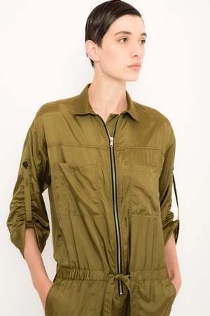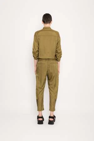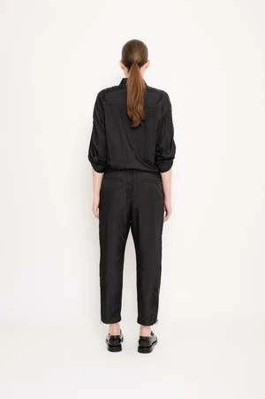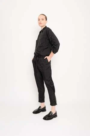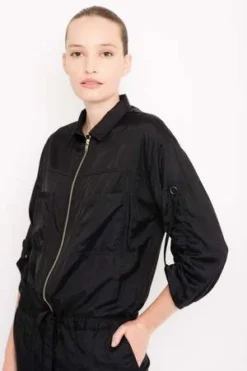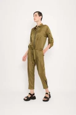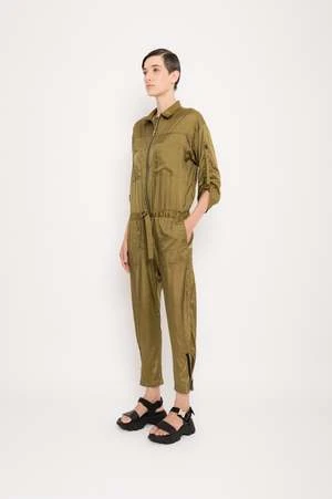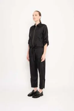 Utilily viscose polyamide satin jumpsuit. Front pockets. Metal zipper for front closure. Sleeves with adjustable strap.