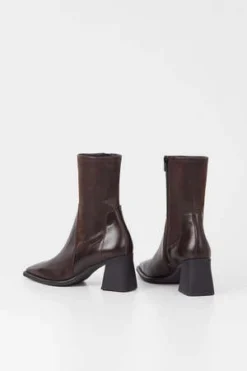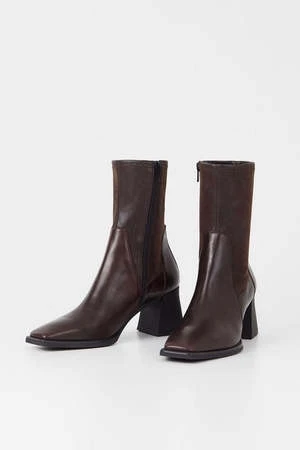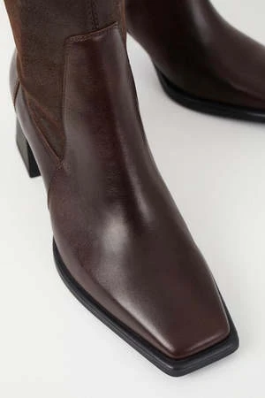 The Hedda by Vagabond is a stylish, mid-height bootie made for your daily adventures. Sleek dark brown leather and synthetic leather come together in a body-hugging mid-calf height with a classic square toe. Inner zipper for easy on/off. A 70mm block heel provides a super chic silhouette. Fits true to size.