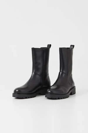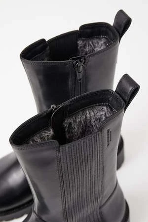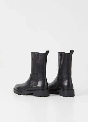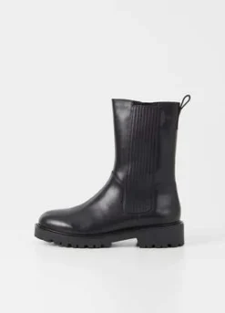 Vagabond Kenova black leather boots with warm lining. Rounded toes, chunky tread sole, and leather gores.