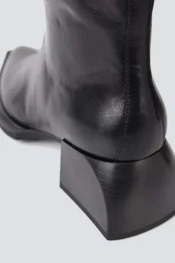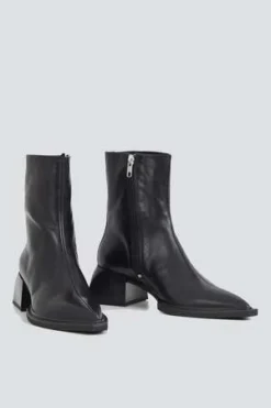 Black Vivian Boot from Vagabond. Vivian is the edgy ankle boots with a contemporary silhouette. The style is crafted in black leather featuring sharp pointed toes and zippers along the shaft. The updated, flared heels measure 55mm.