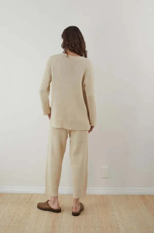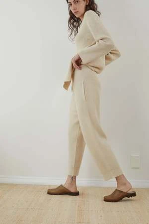 wide leg rib trouser with tighter rib cuffs. elastic waist and side seam pockets for easy wear. this is a mid gauge, making them warm but not too heavy