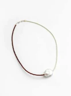– Contrasting green and brown glass seed beads with white freshwater baroque pearl