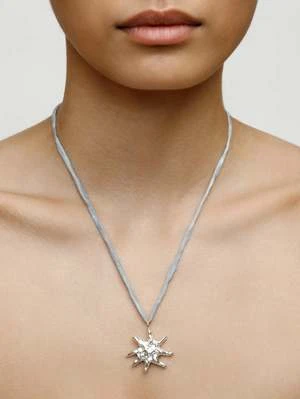 20″ silk cord necklace featuring silver plated bronze shell pendant.
