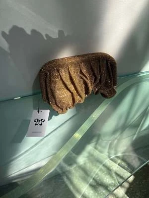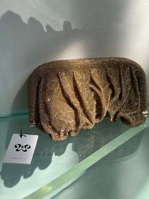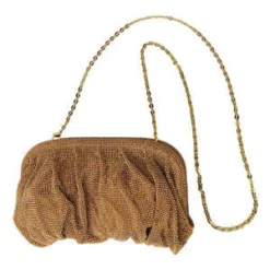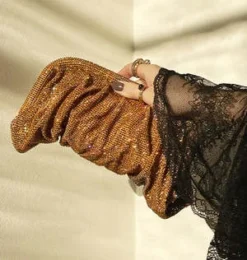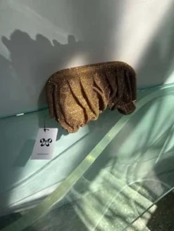 Shine at night with the Champagne handbag. This bag sparkles like the stars in the sky in the most beautiful way. The bag is in clutch shape with pleated rhinestone fabric. You can either carry it in your hand or with the shoulder strap, which is in a nice gold color. Here is the champagne bag in a beautiful gold color.