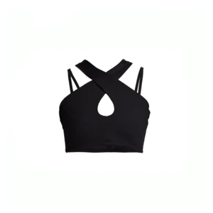 The Year of Ours Double Bra is a strappy sports bra with a center keyhole halter neck finished in a rib-knit. Pullover style, machine wash, made in USA. About 13″ from shoulder to hem.