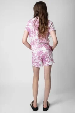 This chic and romantic cotton playsuit is adorned with the season’s must-have Toile-de-Jouy print. With a round neckline, short sleeves and buttoned closure, it ties at the waist and features openwork details.