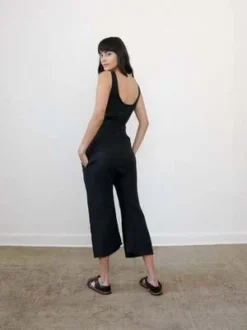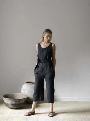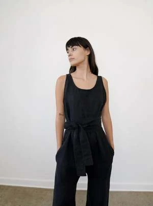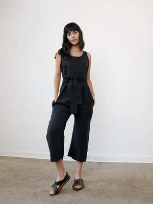 The Wey Jumpsuit by Zii Ropa accentuates the waist with its wrap-around belt attached on both sides. The jumpsuit can be tied in the front or back and features a raw hem for the pant. This jumpsuit is a step-in style with no closures.